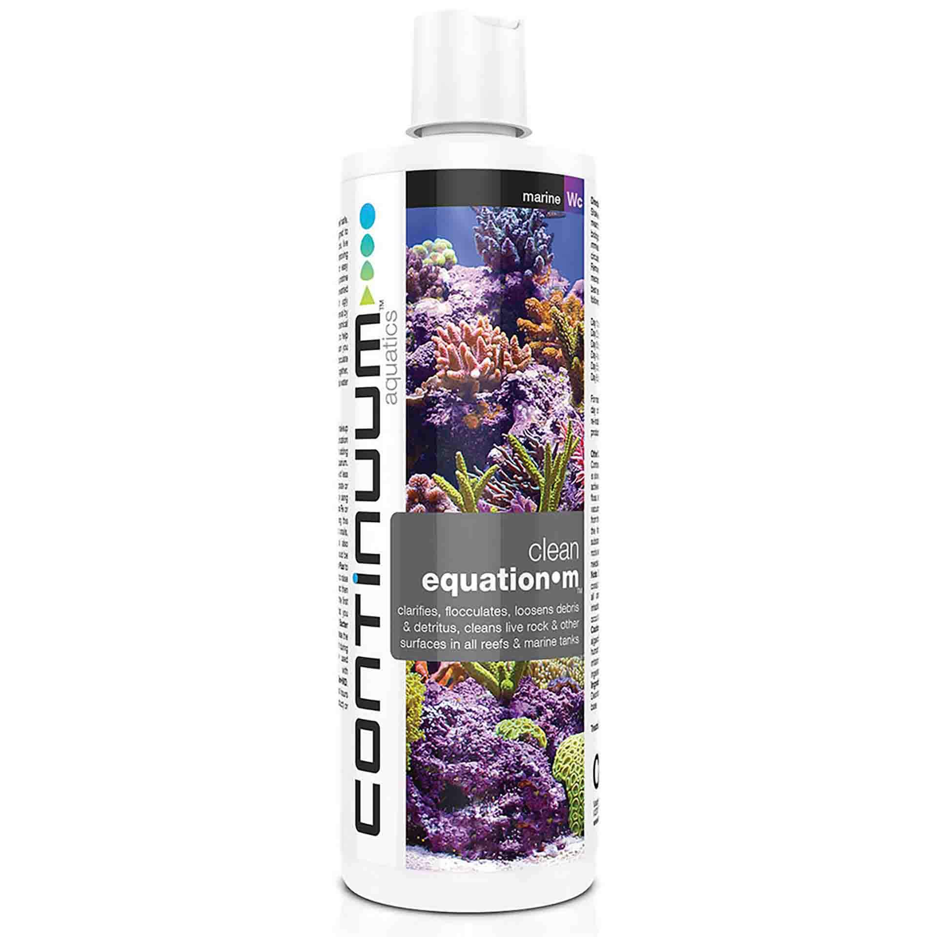 Continuum clean equation M Water Conditioners clarifies, flocculates, loosens debris and detritus, cleans live rock and other surfaces in all reefs and marine tanks.